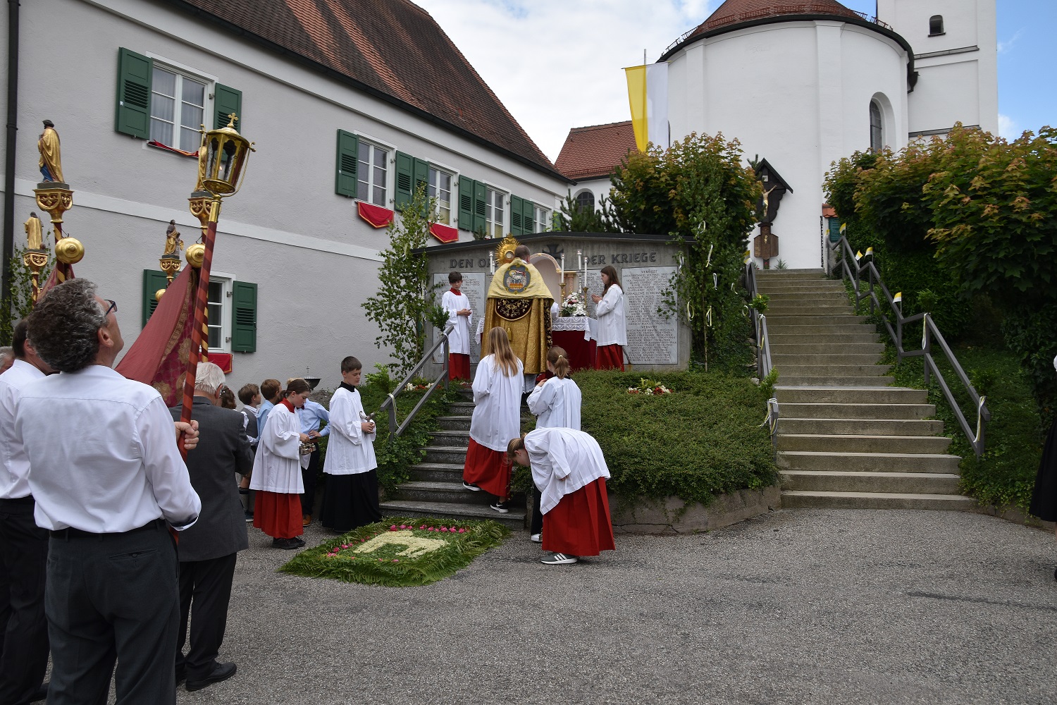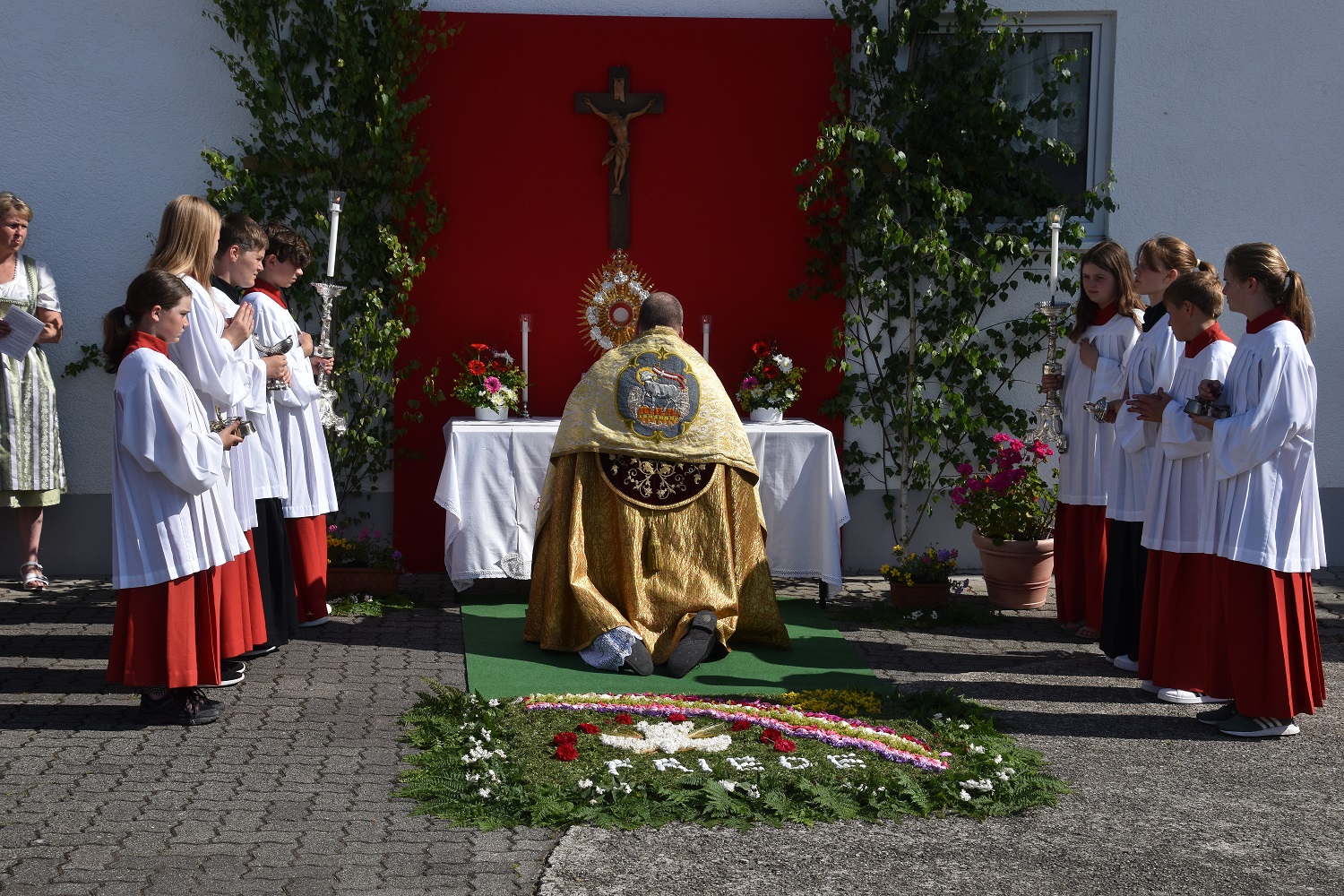 Nach dem Hochamt, zelebriert von Offizialatsrat Joachim Kunz, wurde das Allerheiligste durch Baindlkirch getragen, begleitet von den Kommunionkindern, den Fahnenabordnungen der Vereine, dem Kirchenchor Baindlkirch und den Gläubigen.