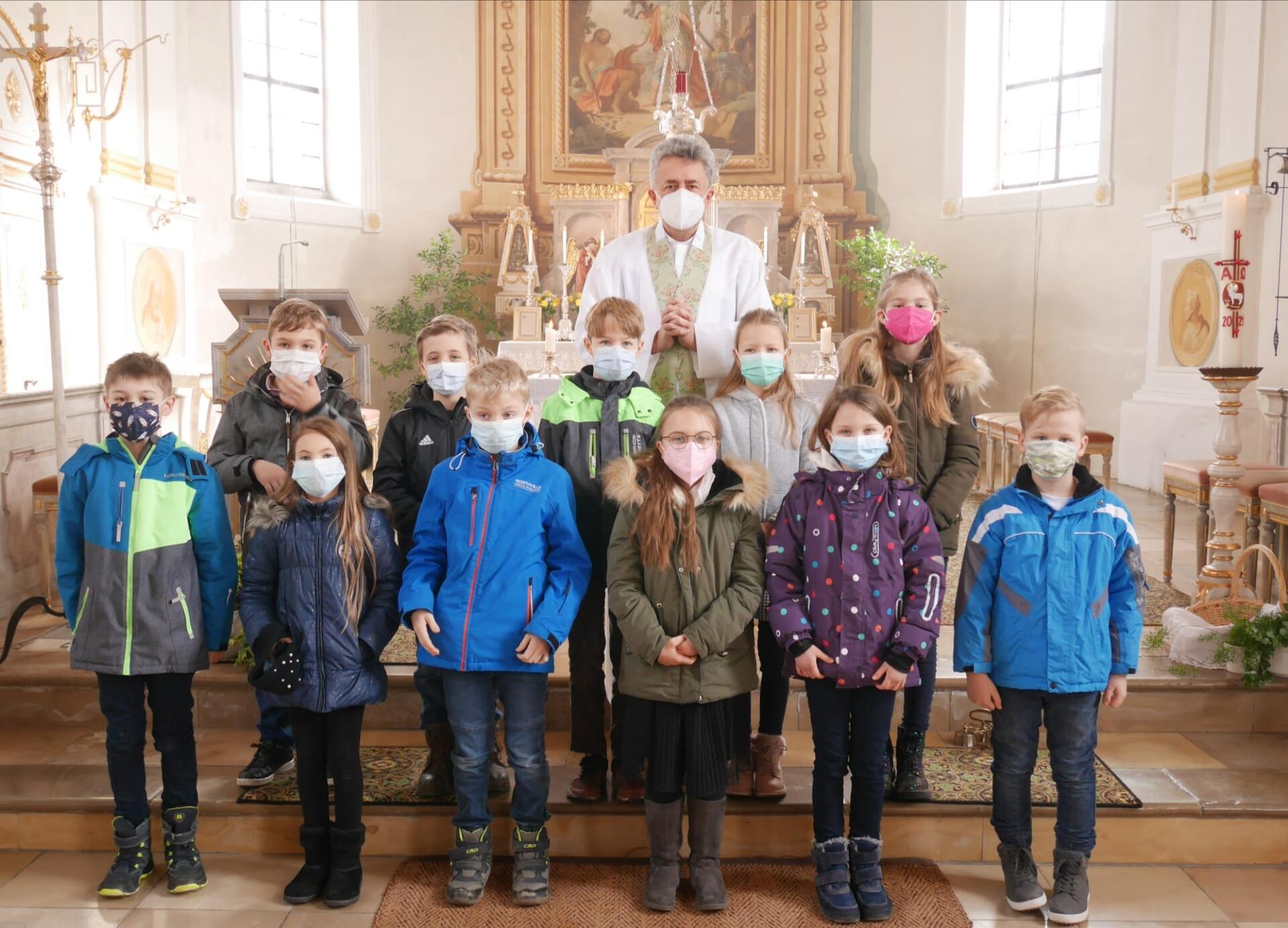 In diesem Jahr feiern 12 Kinder aus Baindlkirch, Eismannsberg, Mittelstetten und Tegernbach am 8. Mai in St. Martin in Baindlkirch gemeinsam ihre erste Heilige Kommunion. Unter dem diesjährigen Leitwort „Jesus unsere Sonne“ bereiten sich die 6 Mädchen und 6 Buben mit viel Eifer neben ihren Religionsstunden in der Schule mit Pfarrer Anton Brandstetter auch seit Januar in zwei Gruppen auf ihren großen Tag vor. Bei einem feierlichen Gottesdienst am 20. Februar in Baindlkirch wurden die Kinder jetzt unserer Pfarrgemeinde vorgestellt und ihre Kommunionkerzen von Pfarrer Brandstetter gesegnet. Die Plätze, die Corona in unserer Pfarrkirche ermöglicht hat, waren alle besetzt. Dies hat unseren Erstkommunionkindern gezeigt, wie viel Unterstützung und Verbundenheit in Gebet und Glaube sie auf ihrem Weg von uns allen erfahren dürfen.